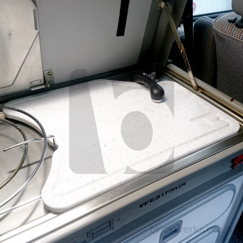Shaped chopping board specially designed to stowe over the sink on VW T3 Westfalia models.