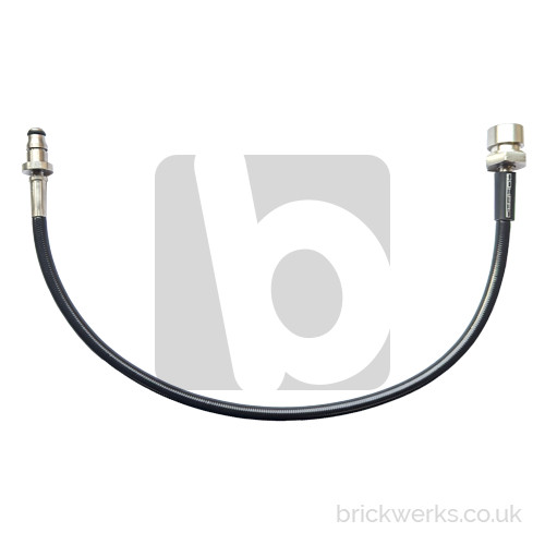 Stainless steel braided teflon hose with PVC covering and stainless steel fittings to suit RHD T4 models with the “Big” gearbox, ones with an INTERNAL clutch slave cylinder with PUSH IN connector.